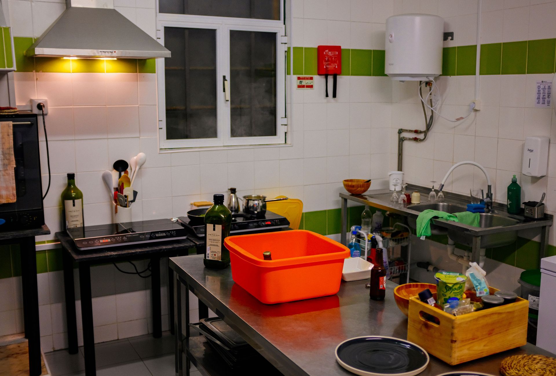 Er zeigt mir ein paar der Gerichte, die sie für die Gruppen zubereiten.