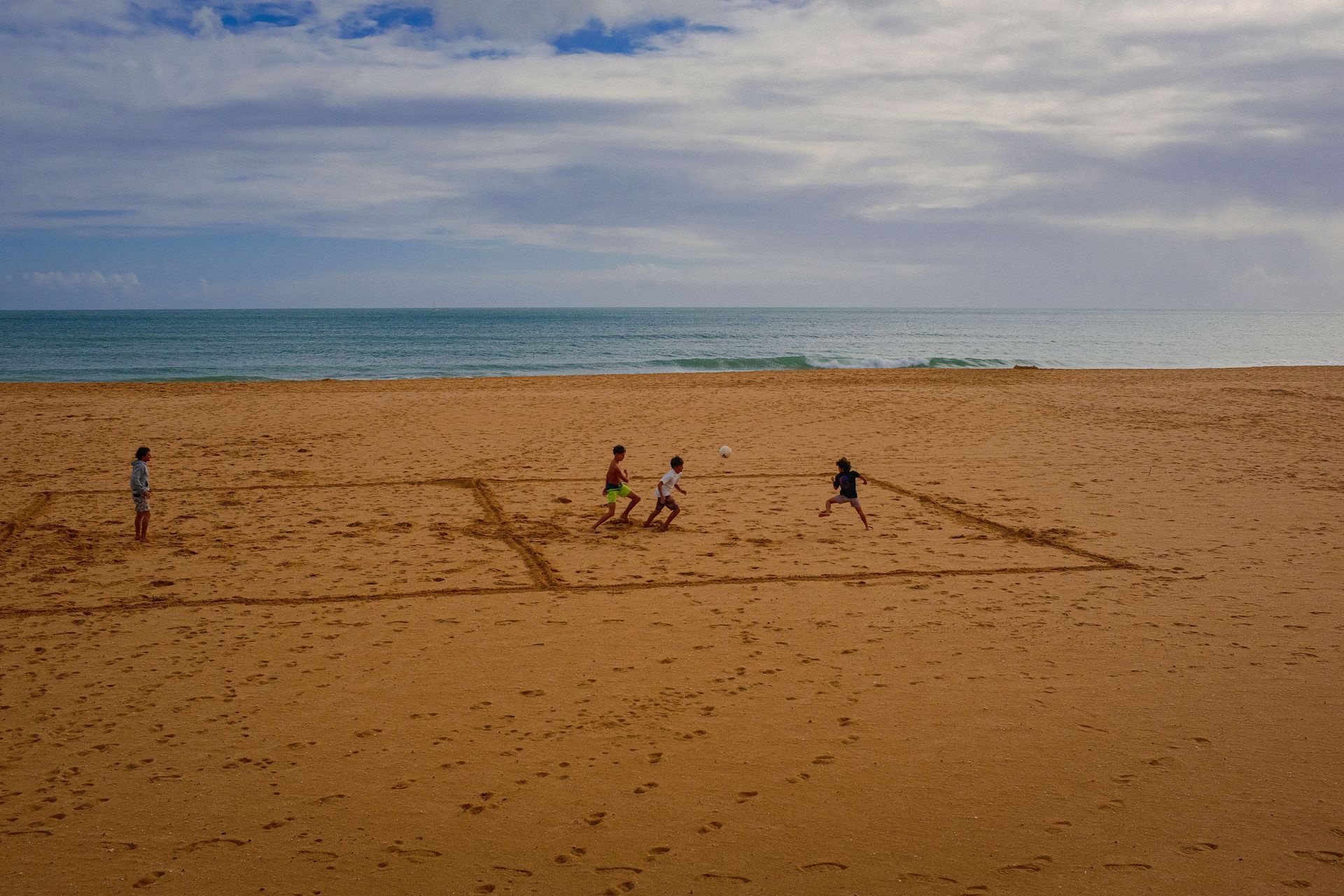 Wir fahren auf die andere Seite und landen an einem wunderschönen Strand. Ein Holzsteg führt direkt über die Dünen. Die Surfer sind diesmal zu weit draußen – dafür haben sich Kinder im Sand einen kleinen Fußballplatz gebaut. Barfuß, lachend, völlig frei. Diese Szenen bleiben hängen.