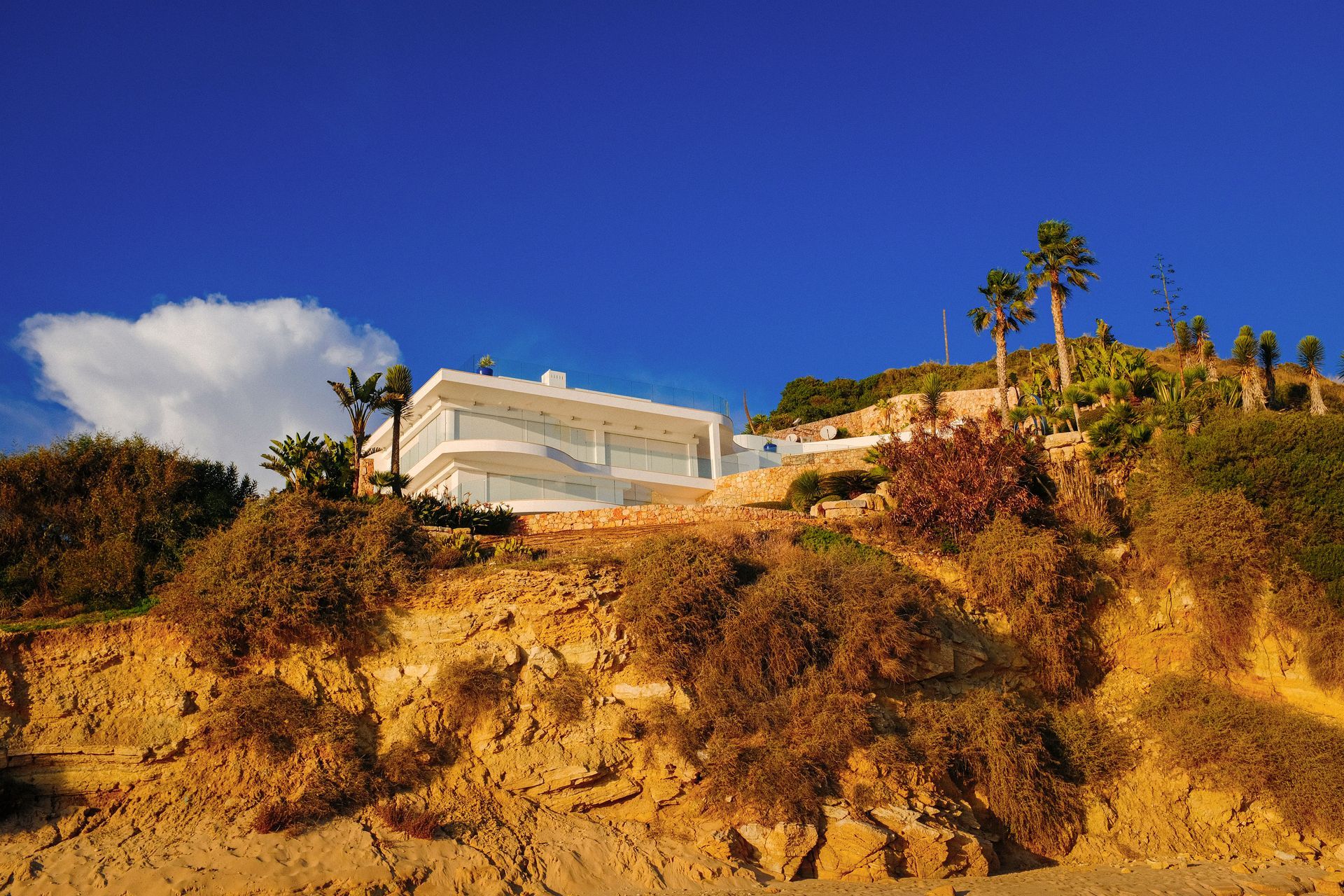 Die gold- bis rotfarbenen Sandsteinfelsen, die steil aus dem Meer ragen, bilden Grotten, Bögen und Felstürme. Das türkisfarbene Wasser, der helle Himmel und die scharfen Kanten der Klippen ergeben eine Kulisse, die fast unwirklich wirkt.
